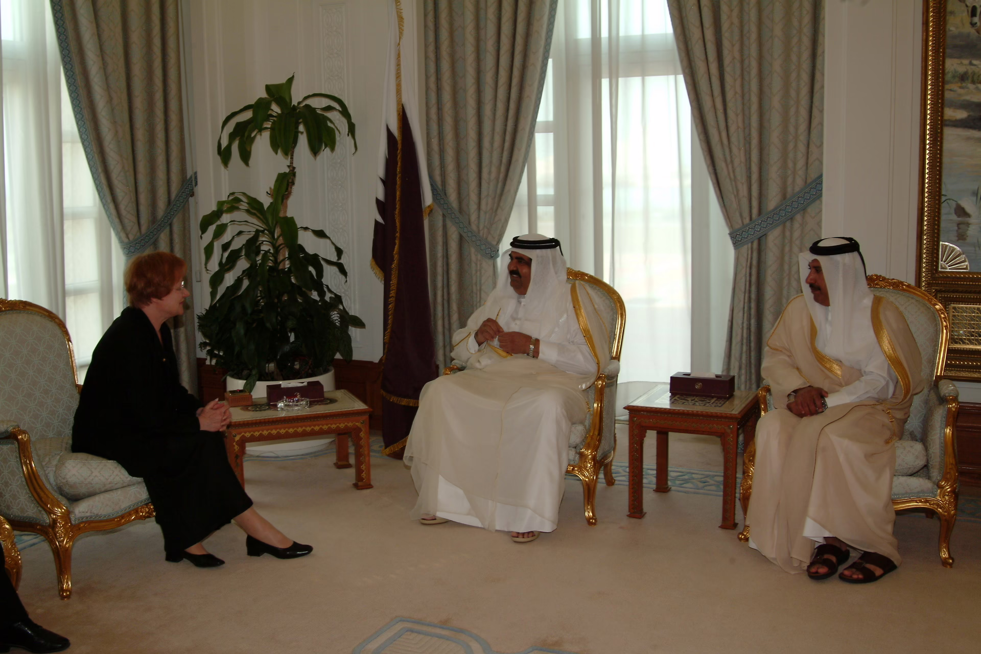 سمو الأمير الشيخ حمد بن خليفة آل ثاني يستقبل فخامة رئيسة جمهورية فنلندا تاريا هالونين في الدوحة بتاريخ 22 أبريل 2007، بحضور معالي رئيس مجلس الوزراء وزير الخارجية الشيخ حمد بن جاسم بن جبر آل ثاني، وعدد من كبار المسؤولين.