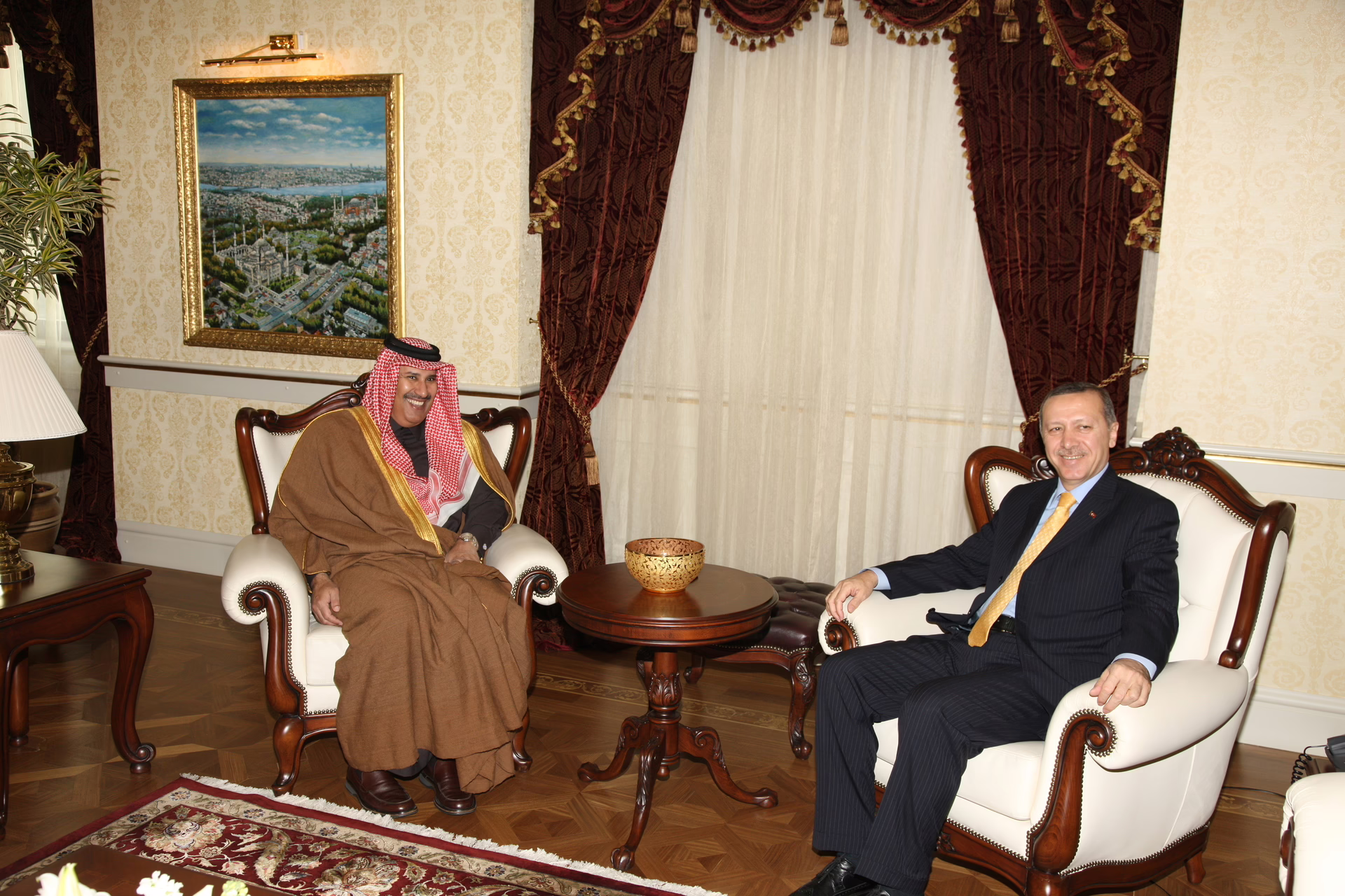 معالي رئيس مجلس الوزراء وزير الخارجية الشيخ حمد بن جاسم بن جبر آل ثاني يلتقي دولة رئيس وزراء جمهورية تركيا السيد رجب طيب أردوغان، في العاصمة أنقرة بتاريخ 4 فبراير 2009.