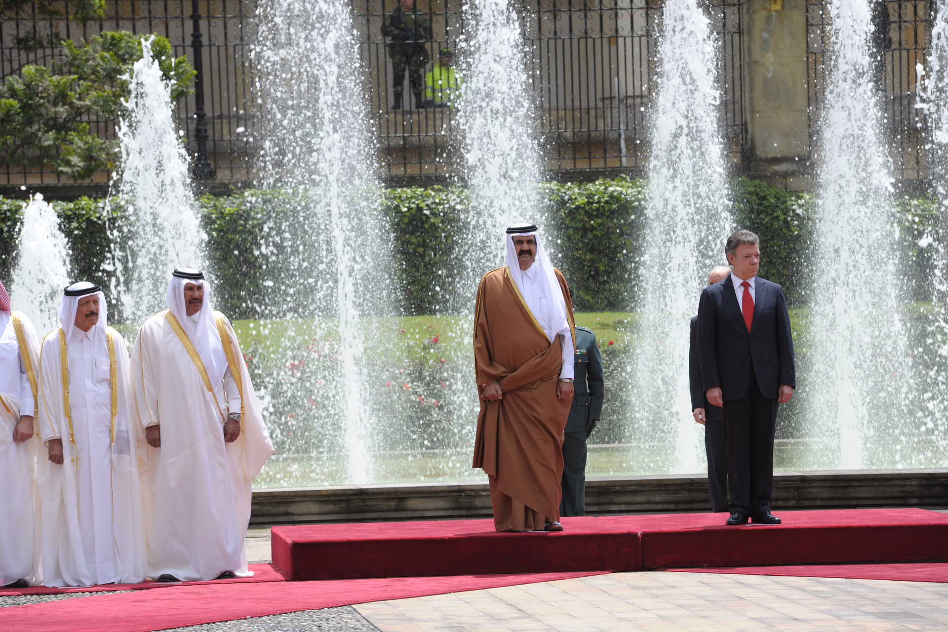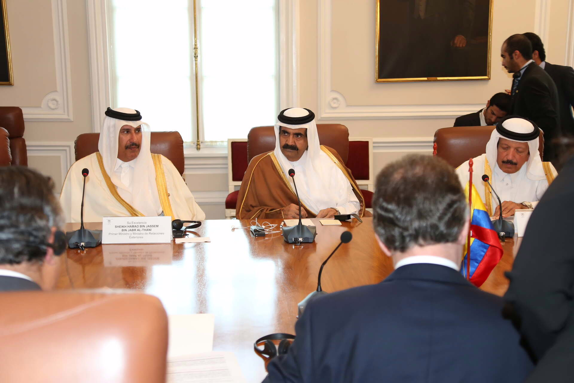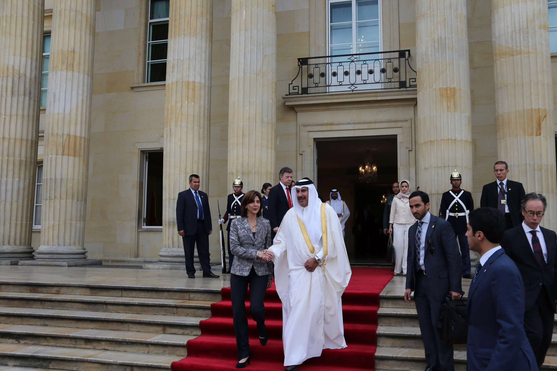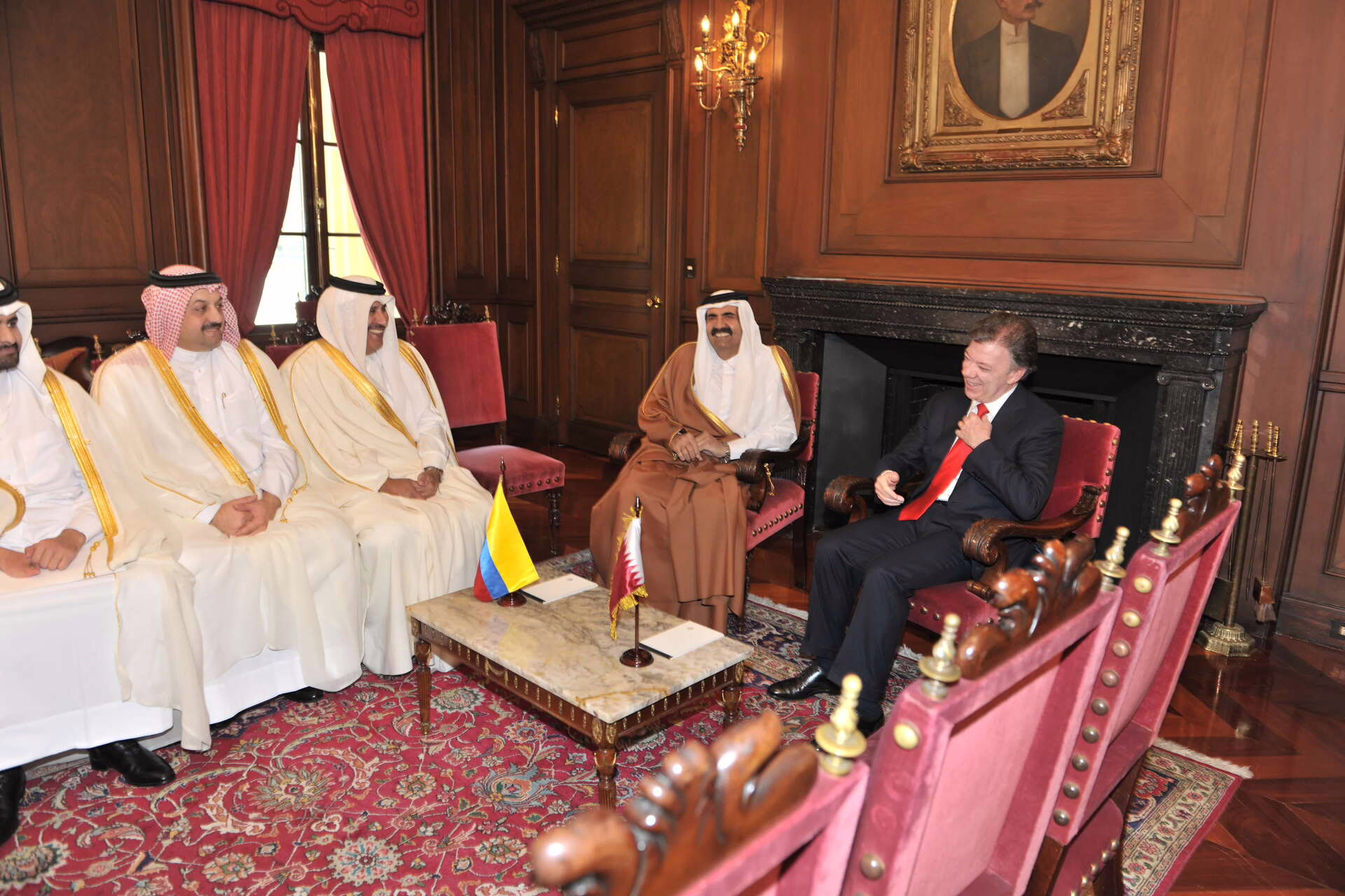 سمو الأمير الشيخ حمد بن خليفة آل ثاني يلتقي في بوغوتا بتاريخ 15 فبراير 2013 فخامة رئيس جمهورية كولومبيا السيد خوان مانويل سانتوس، حيث جرى استعراض علاقات التعاون بين البلدين وسبل تعزيزها، كما شهد الجانبان توقيع عدد من الاتفاقيات ومذكرات التفاهم بين دولة قطر وجمهورية كولومبيا، وذلك بحضور معالي رئيس مجلس الوزراء وزير الخارجية الشيخ حمد بن جاسم بن جبر آل ثاني، ومعالي ماريا أنجيلا هولغوين وزيرة خارجية جمهورية كولومبيا، وسعادة الشيخ عبد الله بن حمد آل ثاني، وعدد من كبار المسؤولين.