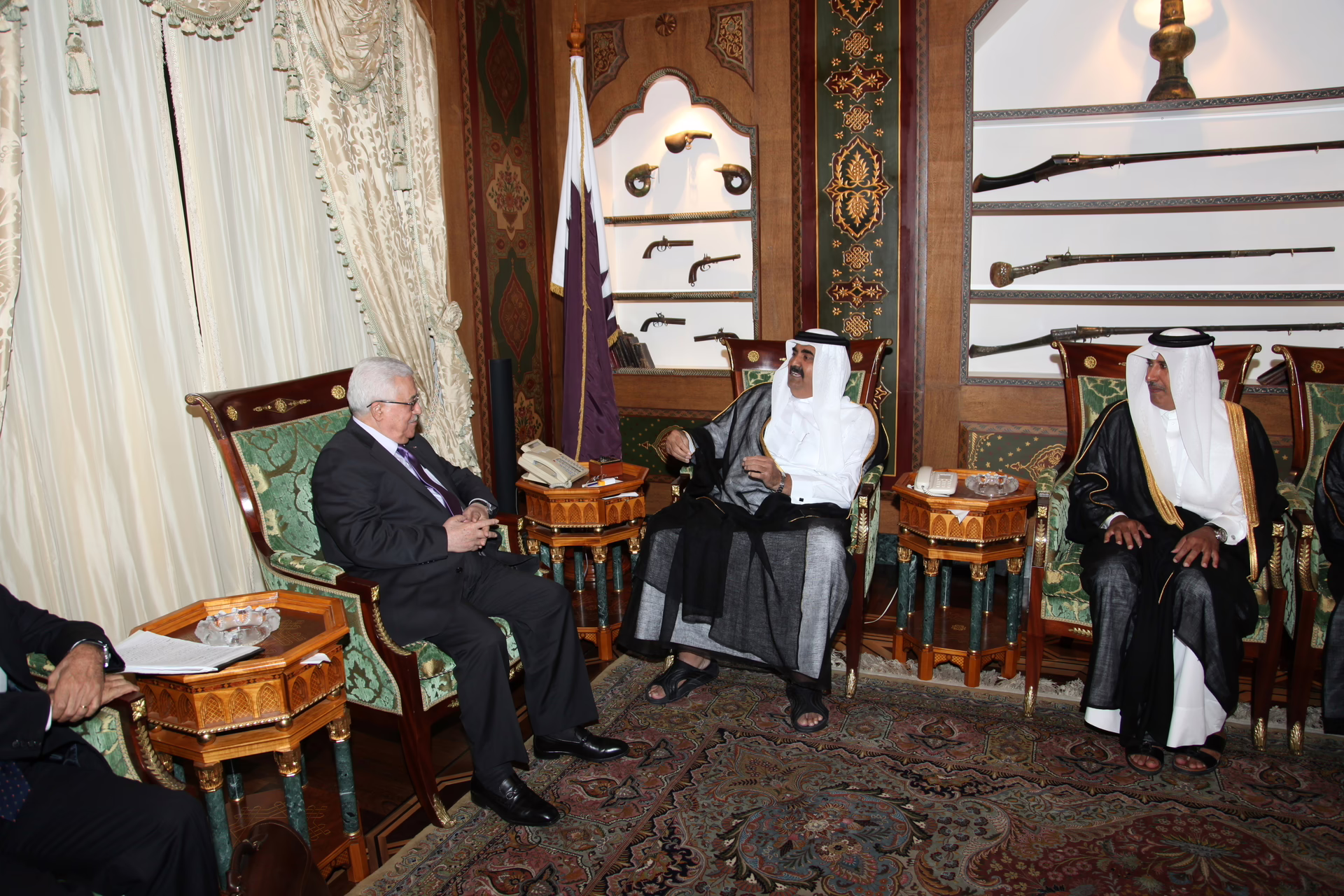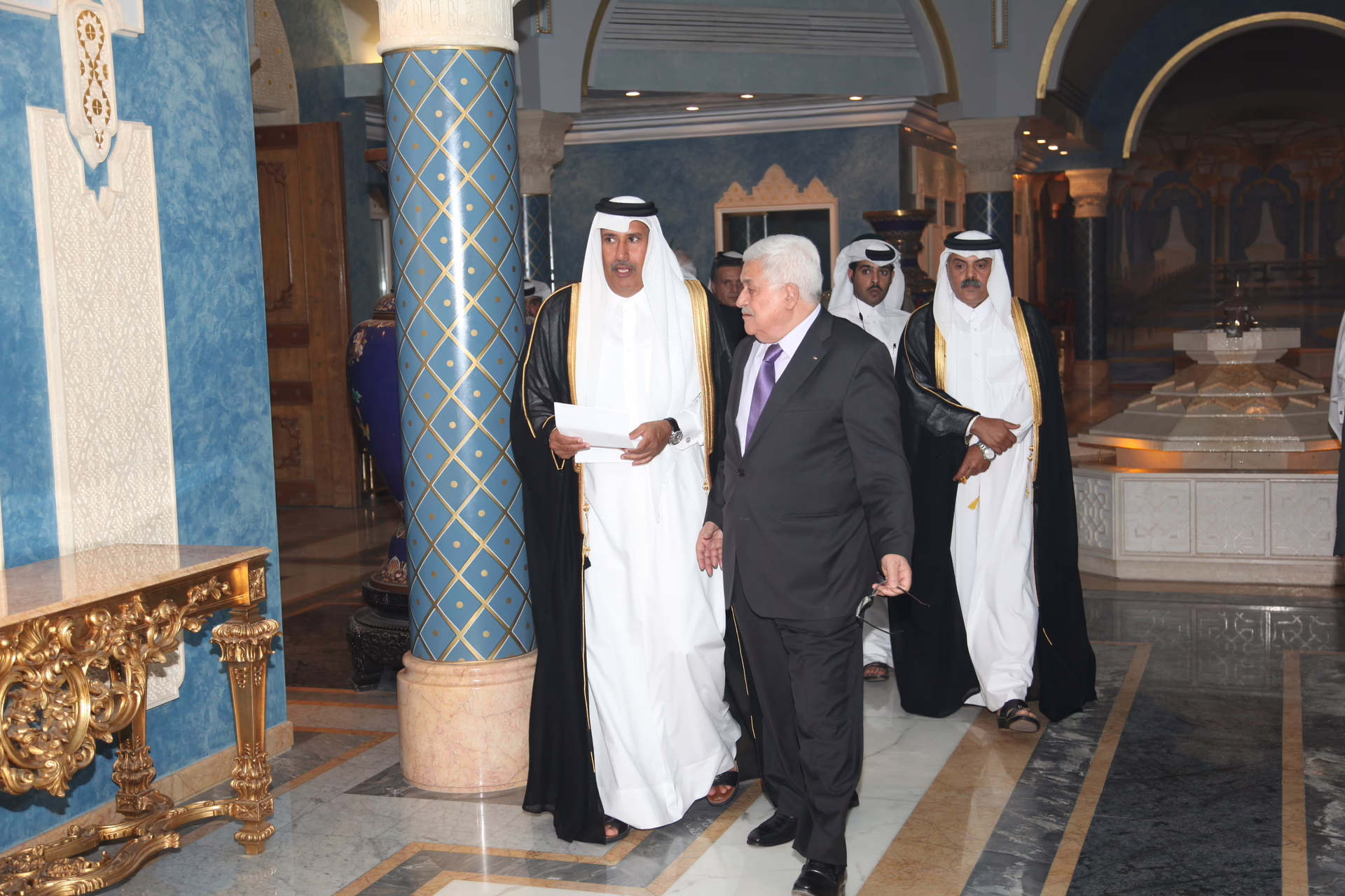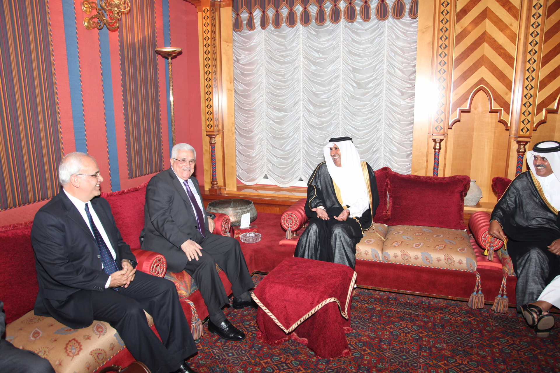 سمو الأمير الشيخ حمد بن خليفة آل ثاني يستقبل في الدوحة بتاريخ 13 أغسطس 2010 فخامة الرئيس الفلسطيني محمود عباس، بحضور معالي رئيس مجلس الوزراء وزير الخارجية الشيخ حمد بن جاسم بن جبر آل ثاني، وعدد من كبار المسؤولين الفلسطينيين من بينهم الدكتور صائب عريقات رئيس دائرة شؤون المفاوضات، وعزام الأحمد رئيس كتلة حركة فتح في المجلس التشريعي.