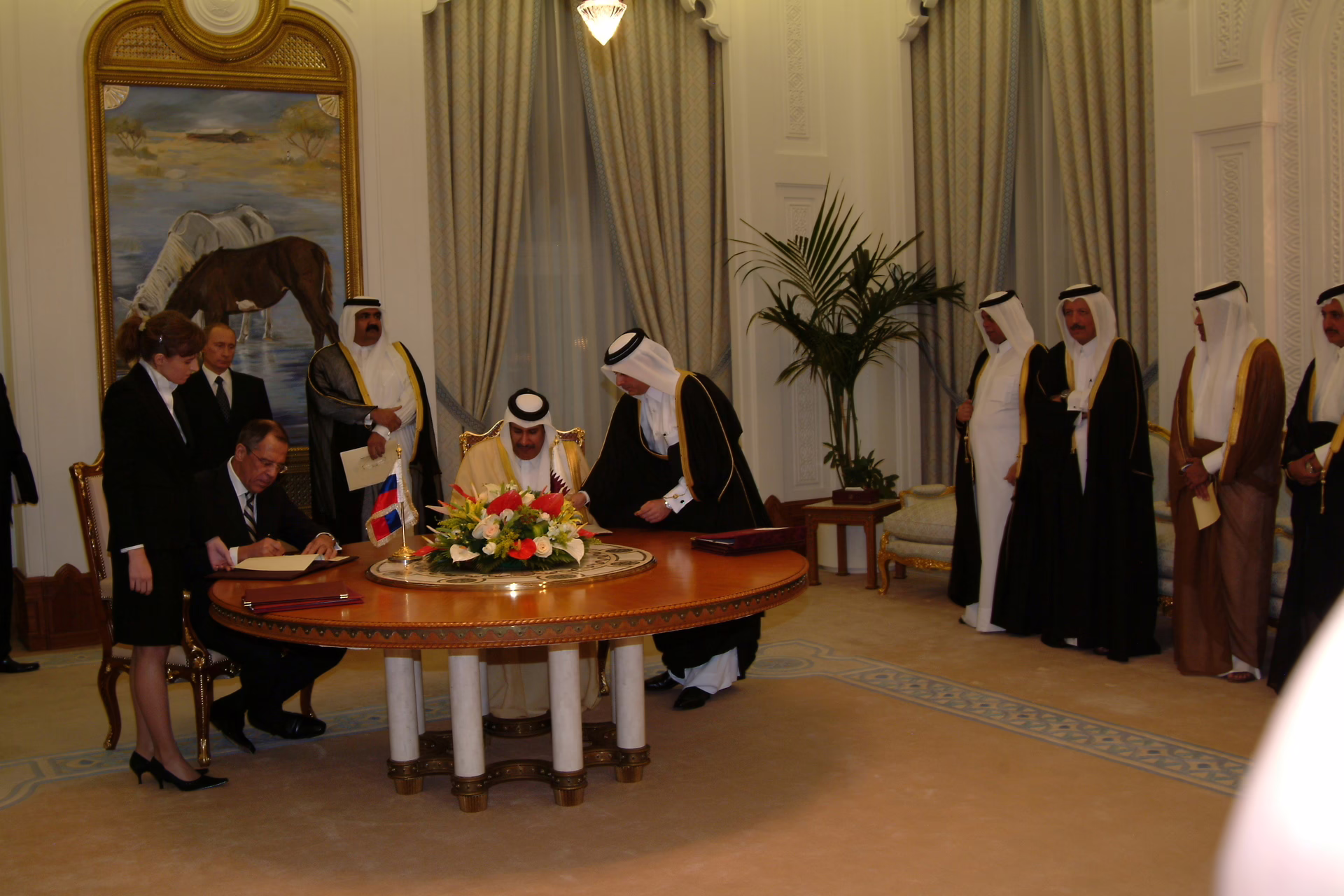 سمو الأمير الشيخ حمد بن خليفة آل ثاني يستقبل فخامة رئيس روسيا الاتحادية فلاديمير بوتين في الدوحة بتاريخ 12 فبراير 2007، حيث عقدا جلسة مباحثات رسمية، وتم توقيع عدد من الاتفاقيات، إضافة إلى عقد مؤتمر صحفي مشترك، وذلك بحضور سمو ولي العهد الشيخ تميم بن حمد بن خليفة آل ثاني، ومعالي النائب الأول لرئيس مجلس الوزراء وزير الخارجية الشيخ حمد بن جاسم بن جبر آل ثاني، وسعادة وزير الخارجية الروسي سيرجي لافروف، وعدد من كبار المسؤولين.