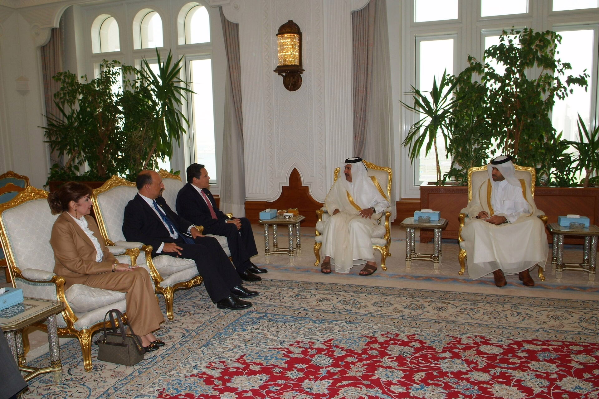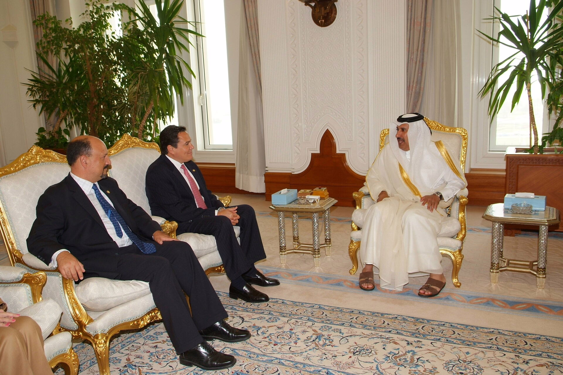 معالي النائب الأول لرئيس مجلس الوزراء وزير الخارجية الشيخ حمد بن جاسم بن جبر آل ثاني يستقبل سعادة وزير خارجية جمهورية السلفادور فرانسيسكو لاينز، وذلك بتاريخ 25 أبريل 2006 في الدوحة. بحضور عدد من المسؤولين.