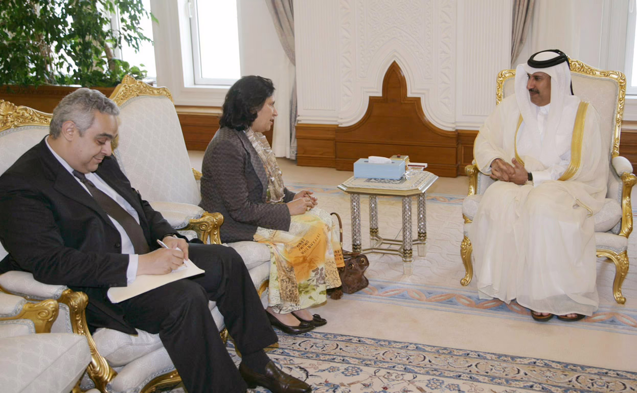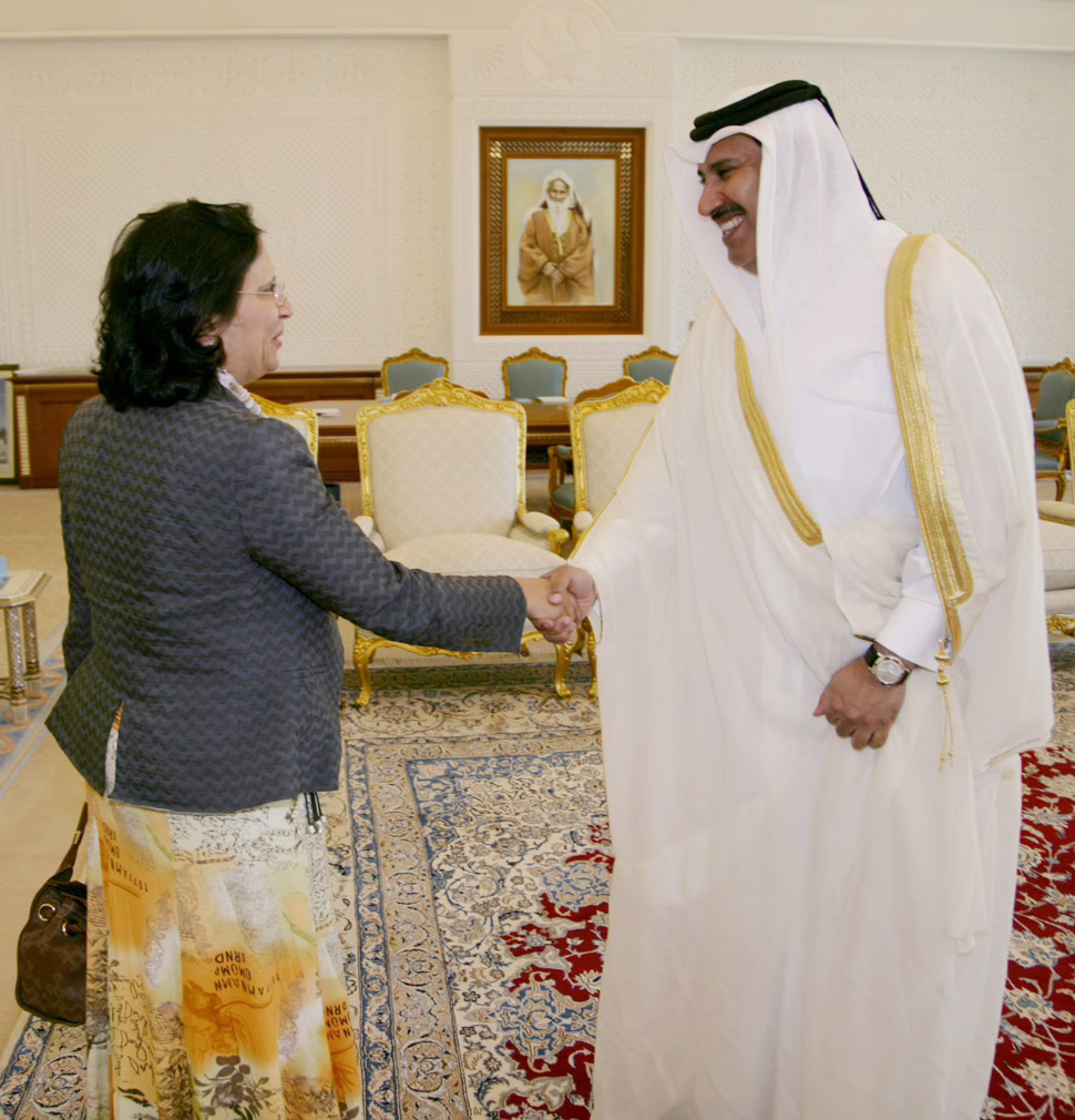 معالي رئيس مجلس الوزراء وزير الخارجية الشيخ حمد بن جاسم بن جبر آل ثاني يستقبل سعادة رئيسة الجمعية العامة للأمم المتحدة للدورة 61 الدكتورة هيا بنت راشد آل خليفة، وذلك في الدوحة بتاريخ 18 يونيو 2007، بحضور سعادة مندوب قطر الدائم لدى الأمم المتحدة السفير ناصر عبد العزيز النصر.
