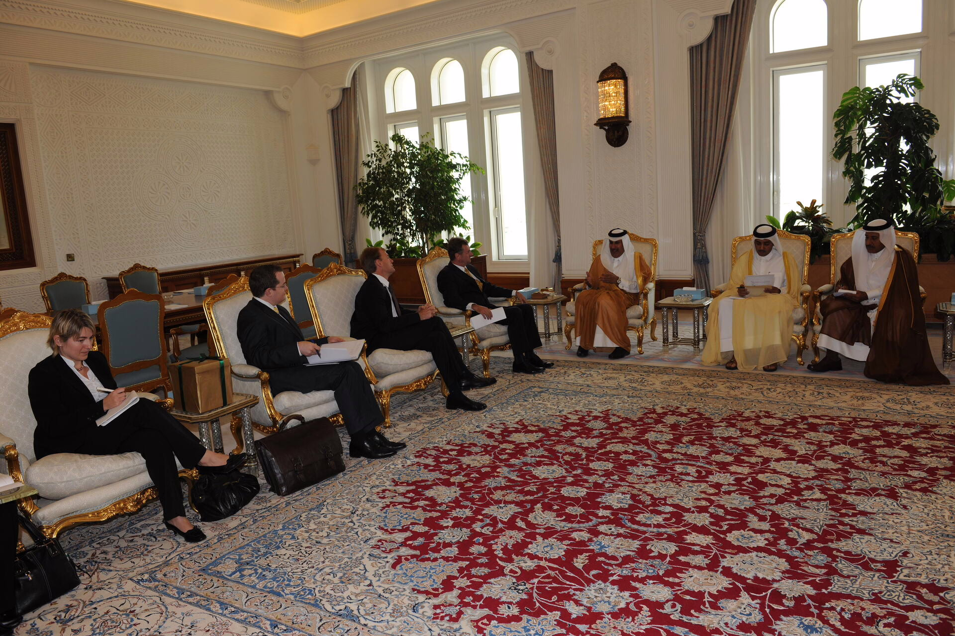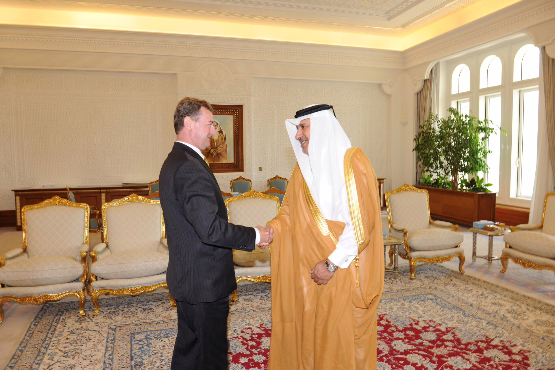 معالي رئيس مجلس الوزراء وزير الخارجية الشيخ حمد بن جاسم بن جبر آل ثاني يستقبل في الدوحة بتاريخ 27 أبريل 2010، معالي السيناتور نِك شيري وزير خزانة أستراليا.