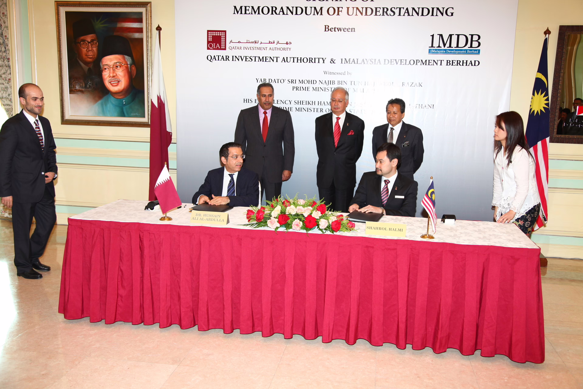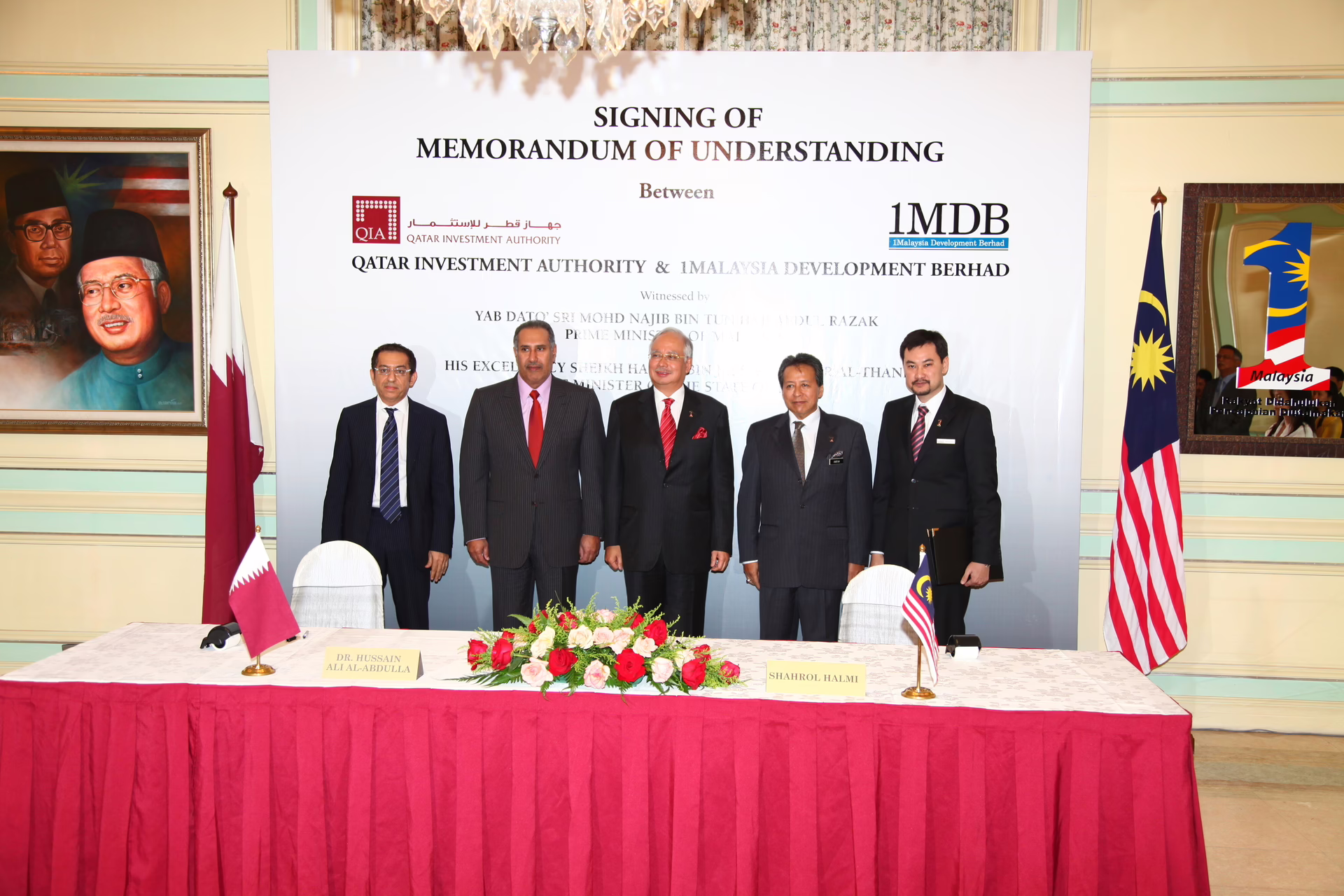 معالي رئيس مجلس الوزراء وزير الخارجية الشيخ حمد بن جاسم بن جبر آل ثاني يشهد في العاصمة الماليزية كوالالمبور بتاريخ 14 مايو 2010 مراسم توقيع اتفاقية شراكة استراتيجية بين جهاز قطر للاستثمار وشركة التنمية الماليزية وان إم دي بي (1MDB)، وذلك بحضور دولة رئيس الوزراء الماليزي نجيب عبدالرزاق، وعضو مجلس الإدارة التنفيذي لجهاز قطر للاستثمار السيد حسين العبدالله، وعدد من كبار المسؤولين من الجانبين.