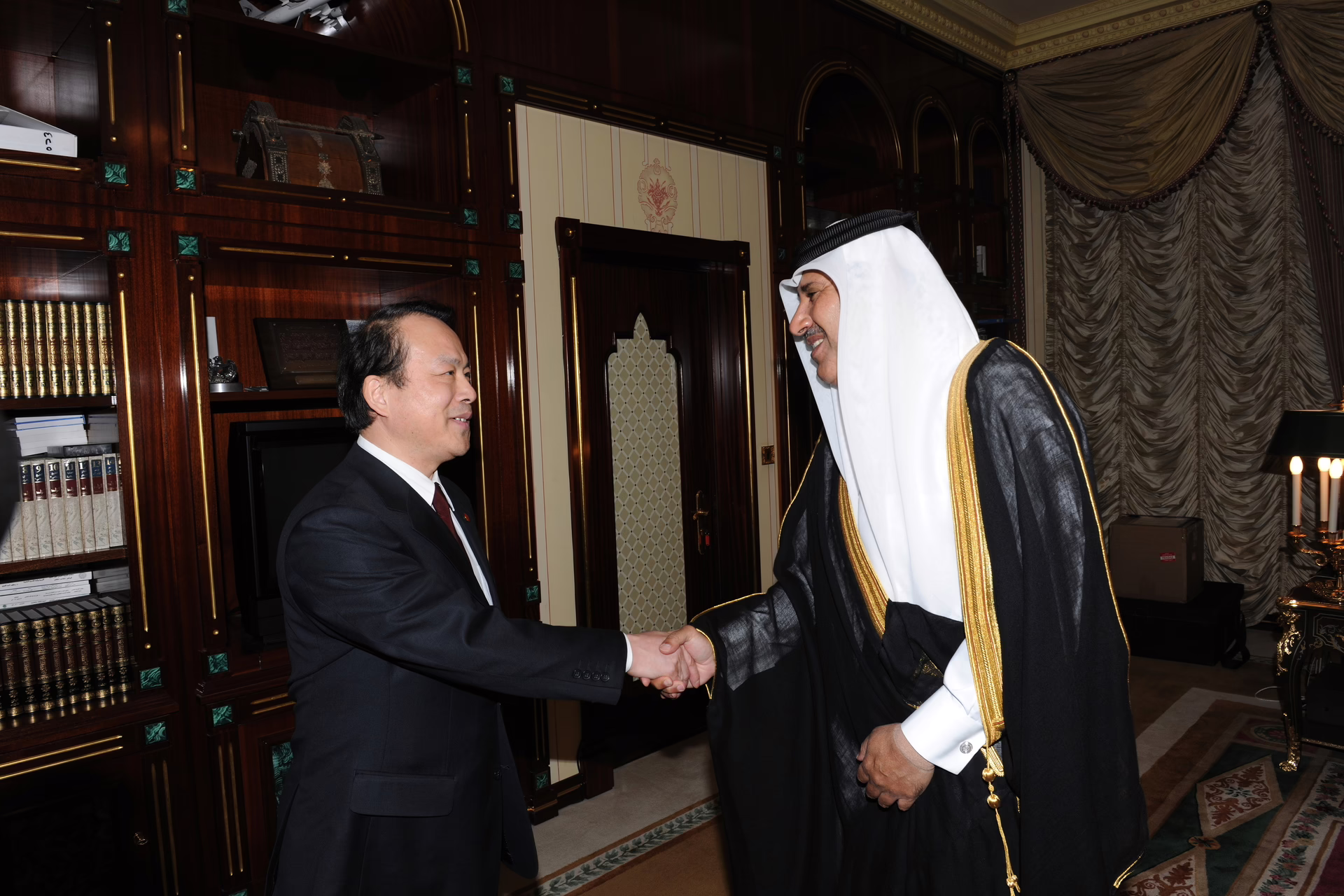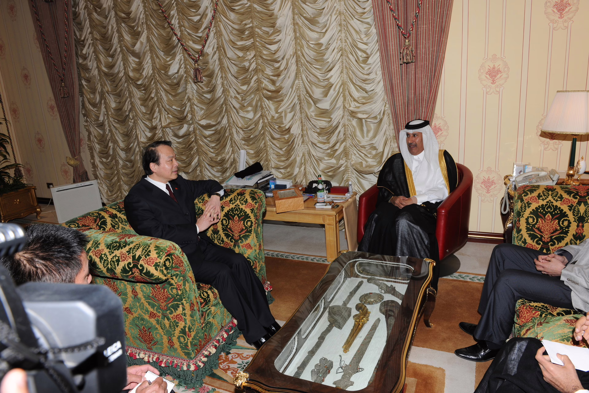 معالي رئيس مجلس الوزراء وزير الخارجية الشيخ حمد بن جاسم بن جبر آل ثاني يستقبل في الدوحة بتاريخ 7 نوفمبر 2010 رئيس تحرير وكالة الأنباء الصينية (شينخوا) السيد هي بنج.