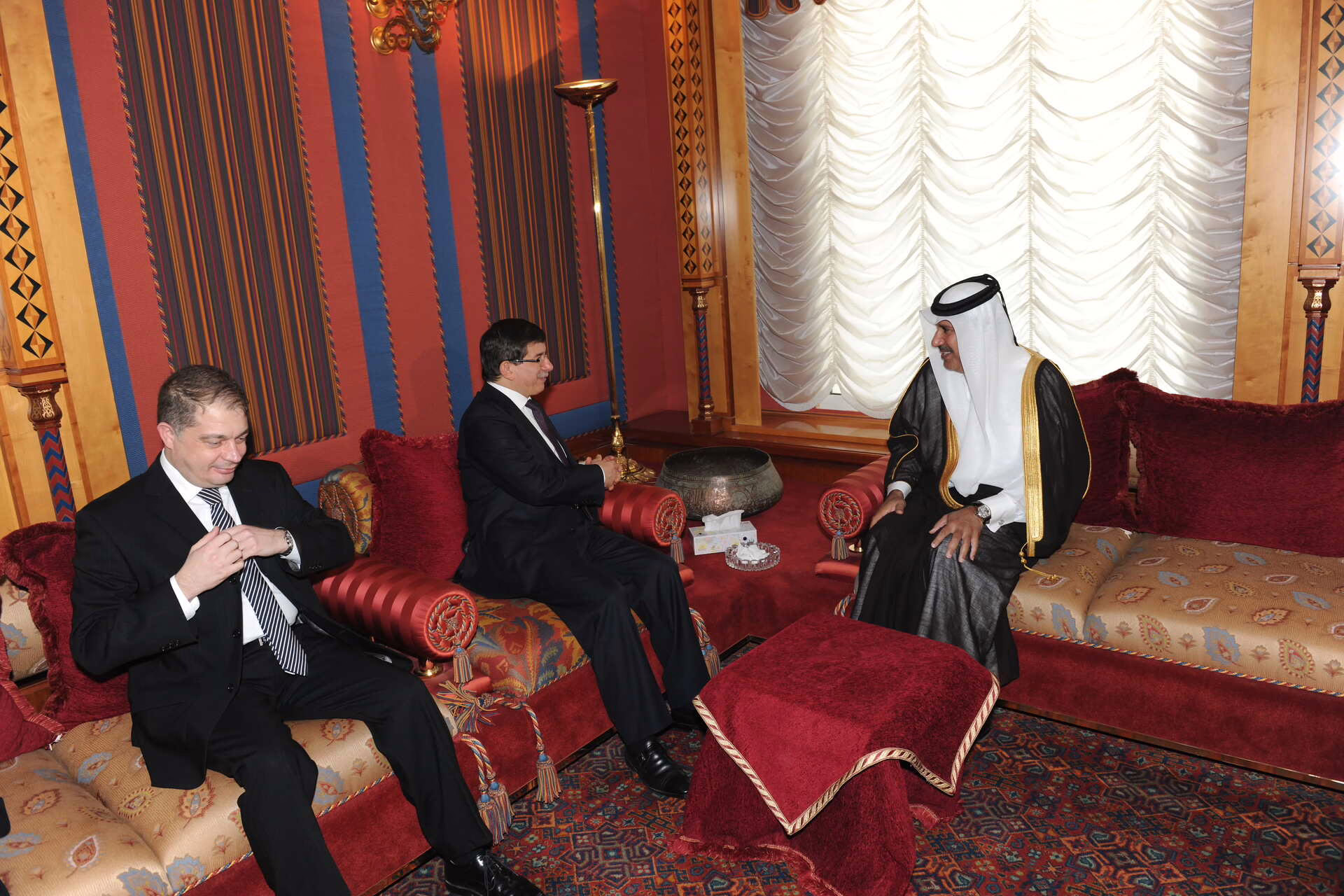 معالي رئيس مجلس الوزراء وزير الخارجية الشيخ حمد بن جاسم بن جبر آل ثاني يستقبل في الدوحة بتاريخ 3 فبراير 2011 معالي وزير خارجية الجمهورية التركية السيد أحمد داوود أوغلو، بحضور عدد من كبار المسؤولين.