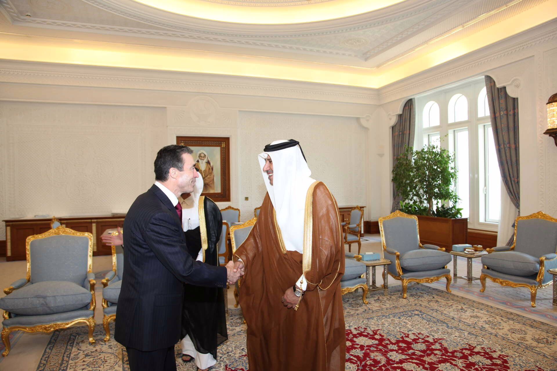 معالي رئيس مجلس الوزراء وزير الخارجية الشيخ حمد بن جاسم بن جبر آل ثاني يستقبل في الدوحة بتاريخ 15 فبراير 2011 الأمين العام لحلف شمال الأطلسي (الناتو) السيد أندرس فوغ راسموسن.
