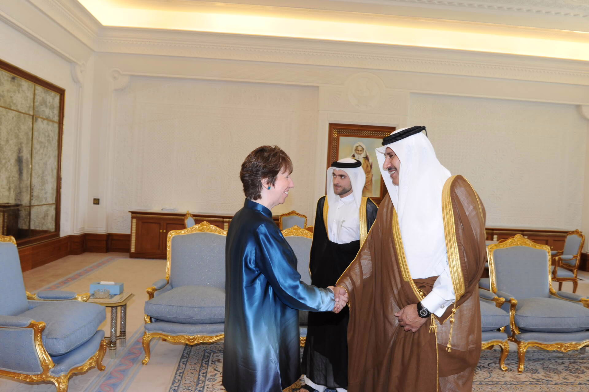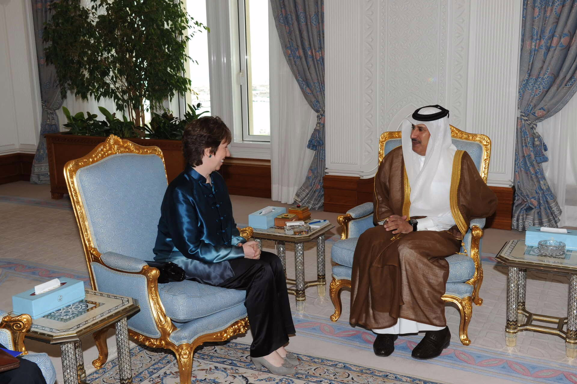 معالي رئيس مجلس الوزراء وزير الخارجية الشيخ حمد بن جاسم بن جبر آل ثاني يستقبل في الدوحة بتاريخ 19 أبريل 2011 الممثلة العليا للاتحاد الأوروبي للشؤون الخارجية والسياسة الأمنية السيدة كاثرين أشتون.