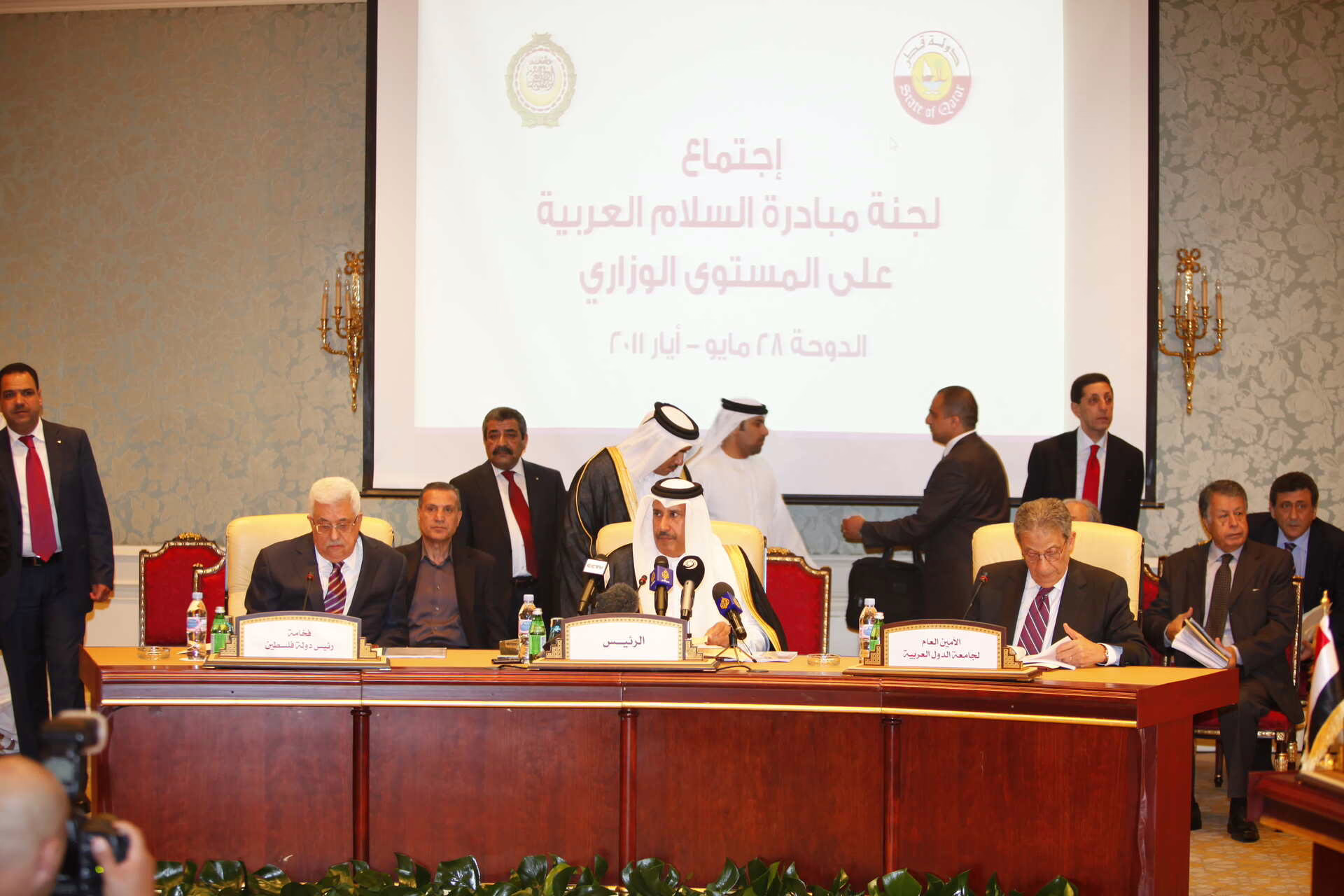 معالي رئيس مجلس الوزراء وزير الخارجية الشيخ حمد بن جاسم بن جبر آل ثاني يترأس في الدوحة بتاريخ 28 مايو 2011 اجتماع اللجنة العربية لمبادرة السلام على المستوى الوزاري، بحضور فخامة رئيس دولة فلسطين السيد محمود عباس، وسعادة الأمين العام لجامعة الدول العربية عمرو موسى، وسعادة الأمين العام المساعد لجامعة الدول العربية أحمد بن حلي، ومعالي وزير الخارجية في المملكة العربية السعودية الأمير سعود الفيصل، ومعالي وزير الخارجية في دولة الإمارات العربية المتحدة الشيخ عبد الله بن زايد آل نهيان، ومعالي وزير الخارجية في المملكة الأردنية الهاشمية ناصر جودة، ومعالي وزير الشؤون الخارجية والتعاون في المملكة المغربية الطيب الفاسي الفهري، ومعالي وزير الشؤون الخارجية في الجمهورية الجزائرية مراد مدلسي، إلى جانب عدد من كبار المسؤولين.