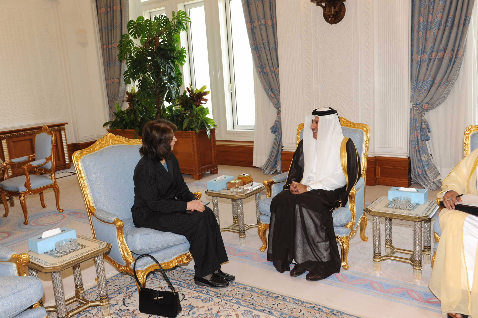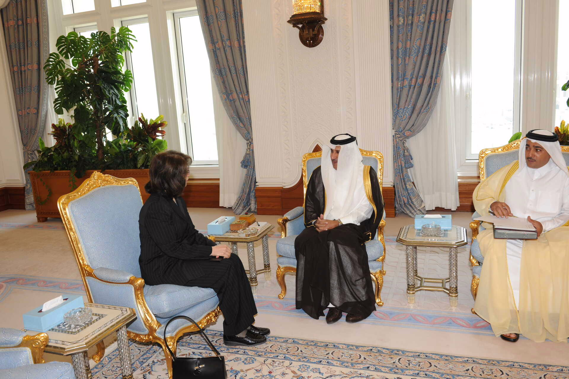معالي رئيس مجلس الوزراء وزير الخارجية الشيخ حمد بن جاسم بن جبر آل ثاني يستقبل في الدوحة بتاريخ 19 أكتوبر 2011 سعادة جان كريستوف بوسيل سفير الجمهورية الفرنسية لدى دولة قطر، وسعادة سوزان ليلى زيادة سفيرة الولايات المتحدة الأمريكية لدى دولة قطر، وسعادة جمعة راشد سيف الظاهري سفير دولة الإمارات العربية المتحدة لدى دولة قطر، وسعادة سليمان الهيفي سفير دولة الكويت لدى دولة قطر.