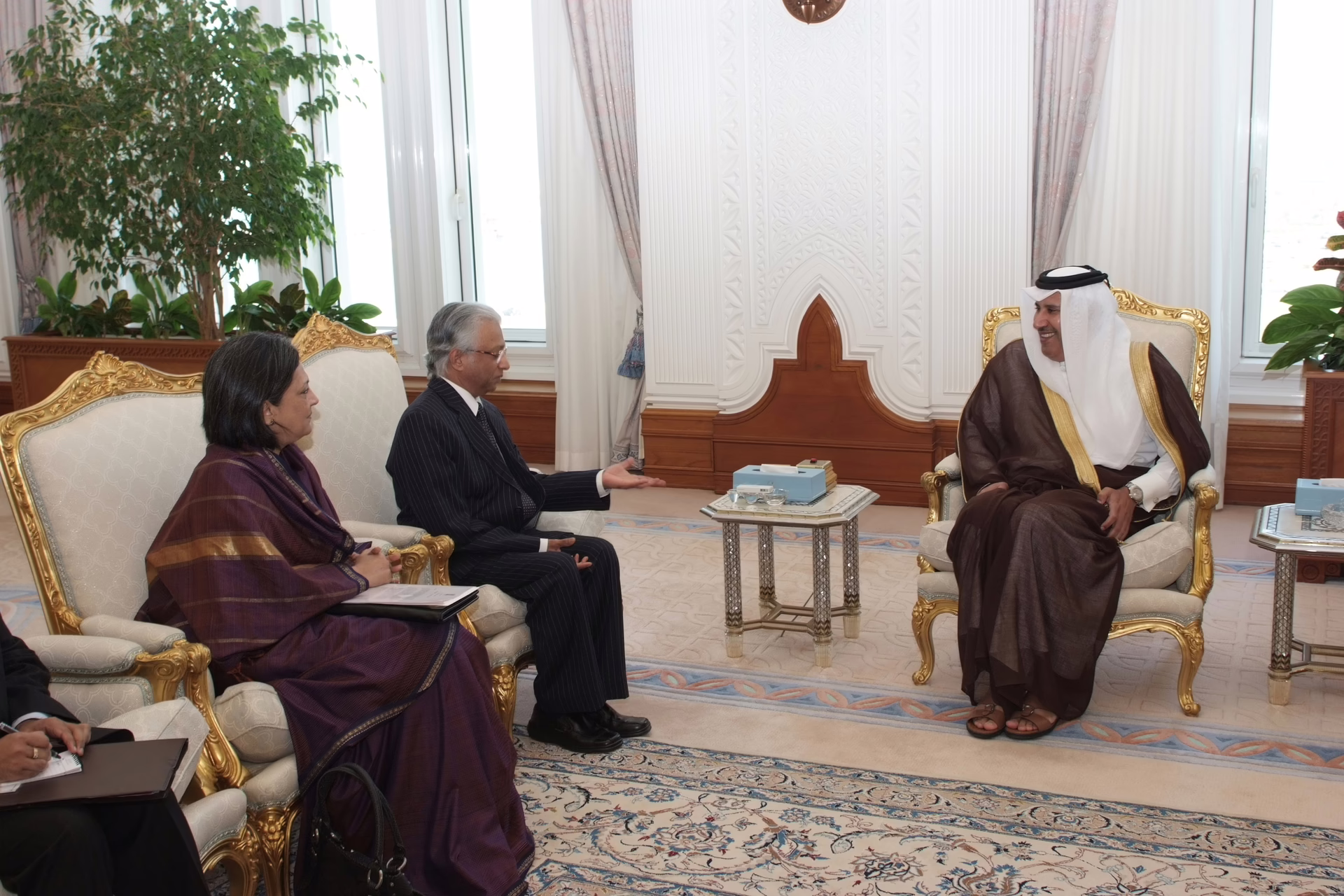 معالي رئيس مجلس الوزراء وزير الخارجية الشيخ حمد بن جاسم بن جبر آل ثاني يستقبل في الدوحة بتاريخ 15 نوفمبر 2009 كلاً من ت. ك. آية ناير سكرتير رئيس وزراء جمهورية الهند، وديبا غوبلان فادفا سفيرة الهند لدى الدولة.