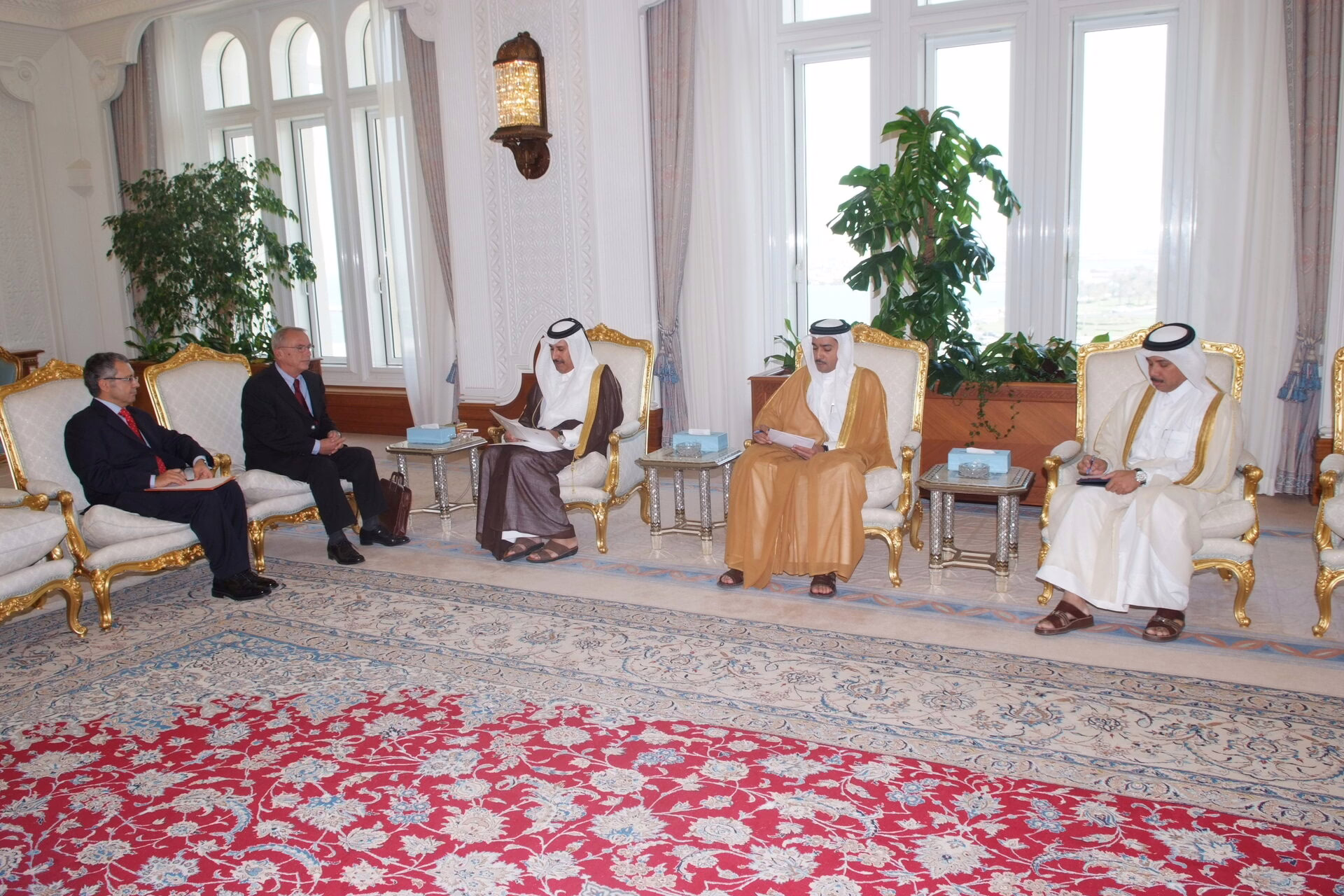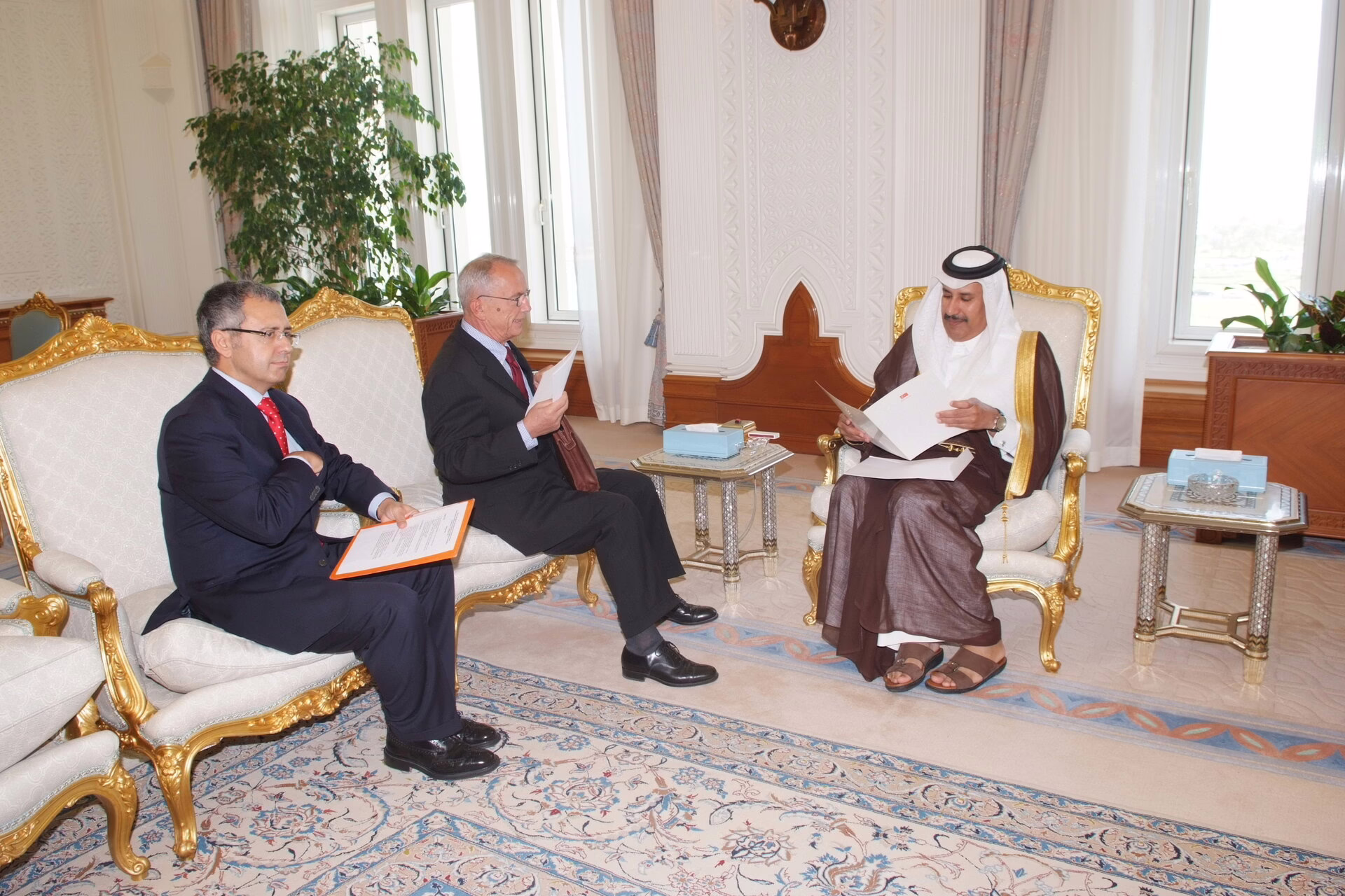معالي رئيس مجلس الوزراء وزير الخارجية الشيخ حمد بن جاسم بن جبر آل ثاني يتسلّم في الدوحة بتاريخ 6 نوفمبر 2007 رسالة خطية من دولة رئيس وزراء الجمهورية التركية رجب طيب أردوغان، نقلها مبعوثه الخاص عثمان دوراك، بحضور سعادة سفير تركيا لدى الدولة مدحت رنده.